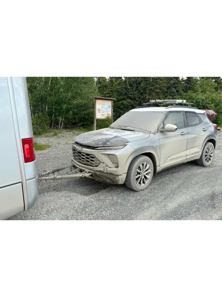 After an approx 10 hour journey covering only 220 miles we eventually arrived in Tok and the first stop was Teroso gas station where they provide a free power washer with a tank fill up. The clean up of Ushingi and tow took us nearly an hour with me brushing and Lynne handling the power washer like a Sabre.