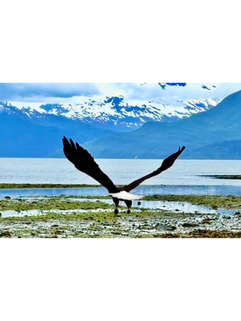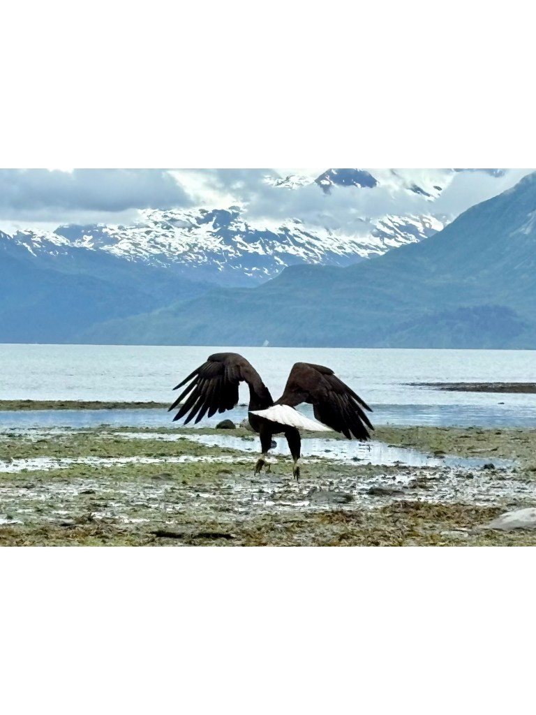 We are still waiting for our campsite reservation so another free night in the parking lot of the Solomon Gulch Fish Hatchery on the opposite side of the Valdez Harbor. Numerous Bald Eagles in the trees behind us.
