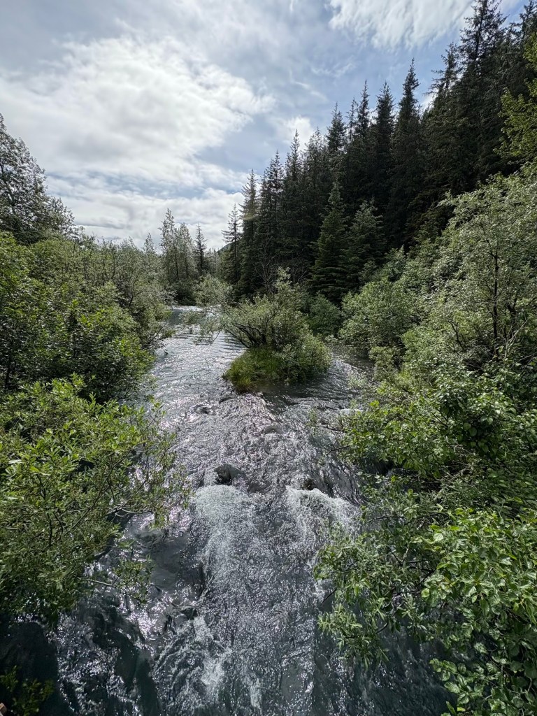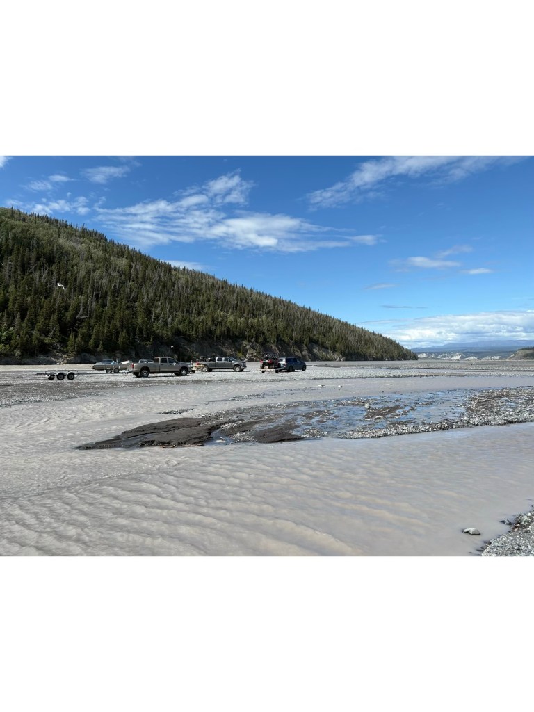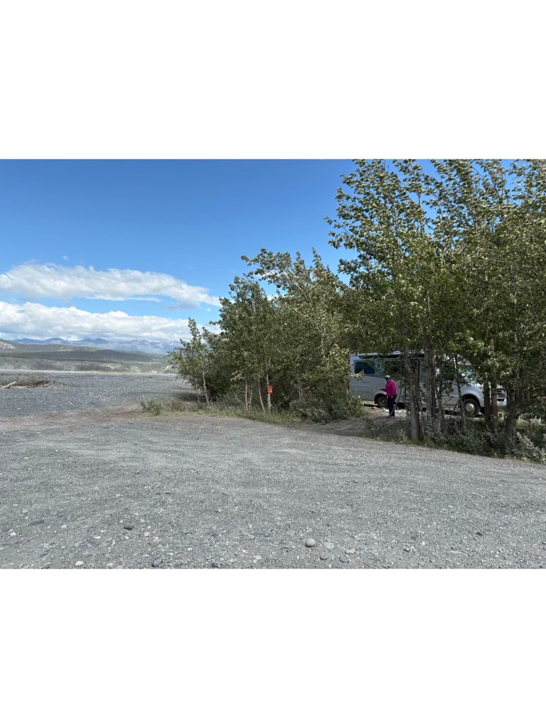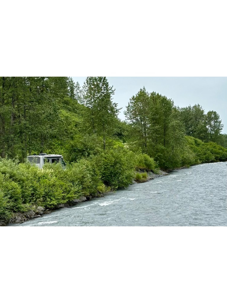 We spent a night at Tolsona Wilderness campground in the Glenallen area. We had a nice pull through site by the river so we didn’t need to unhook the tow. As we were packing up a local Alaskan guy stopped by to chat and give us advice on areas to visit. He recommended Chitina where you drive onto the river bed and park for free with great views. He did warn us it might be busy if the “reds” were running and locals dip netting.